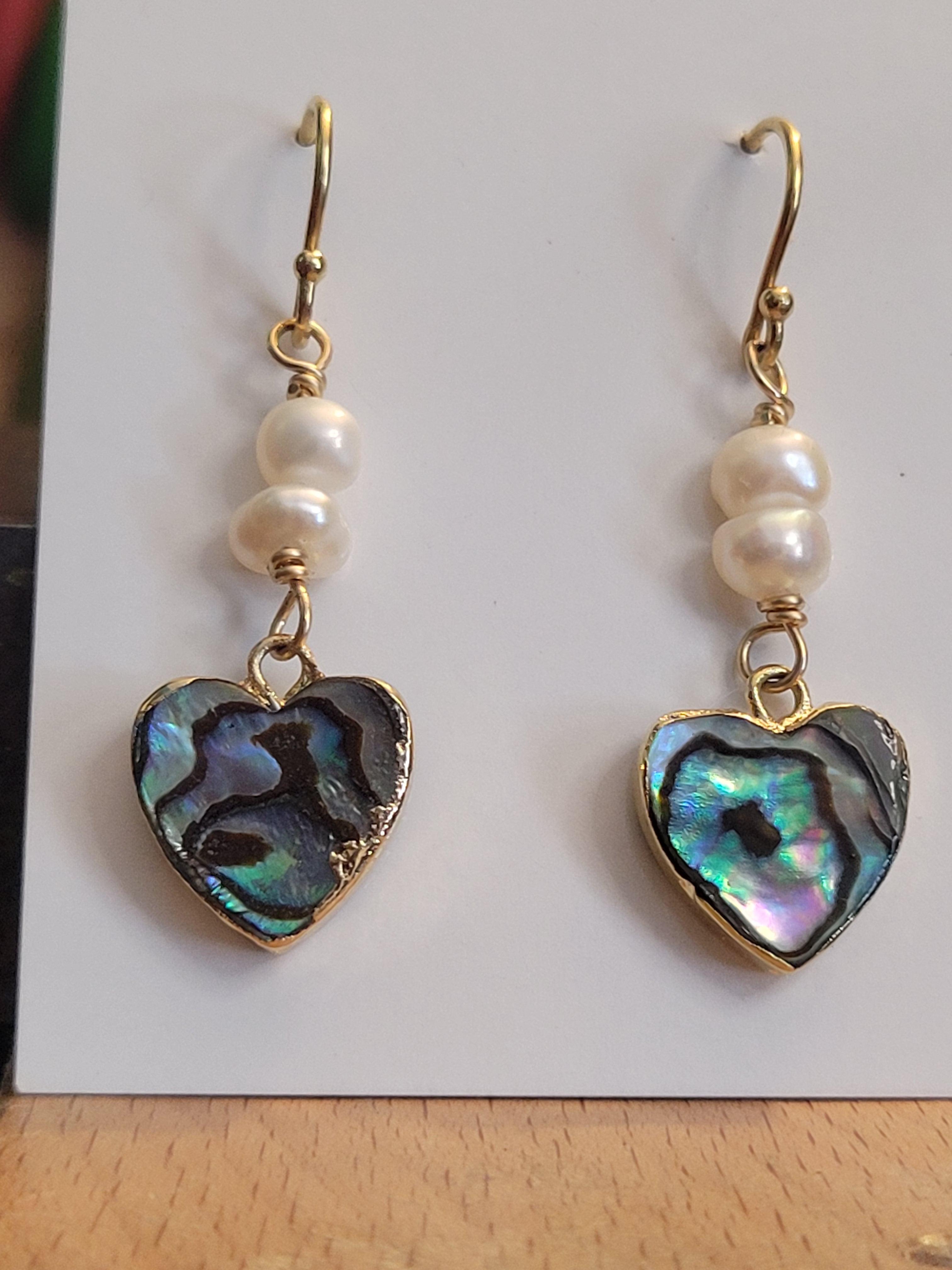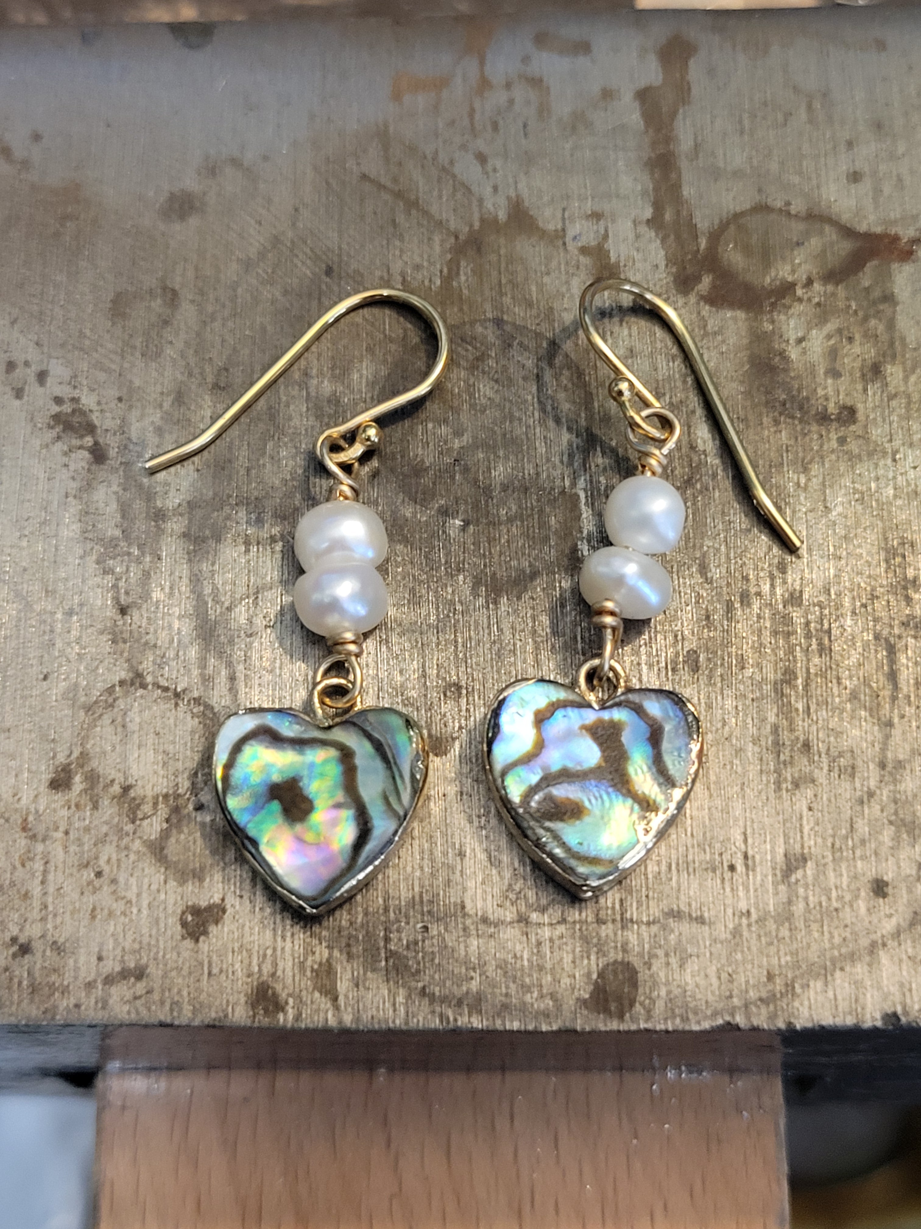 These 13mm abalone hearts and pearl beads come on gold-filled hooks